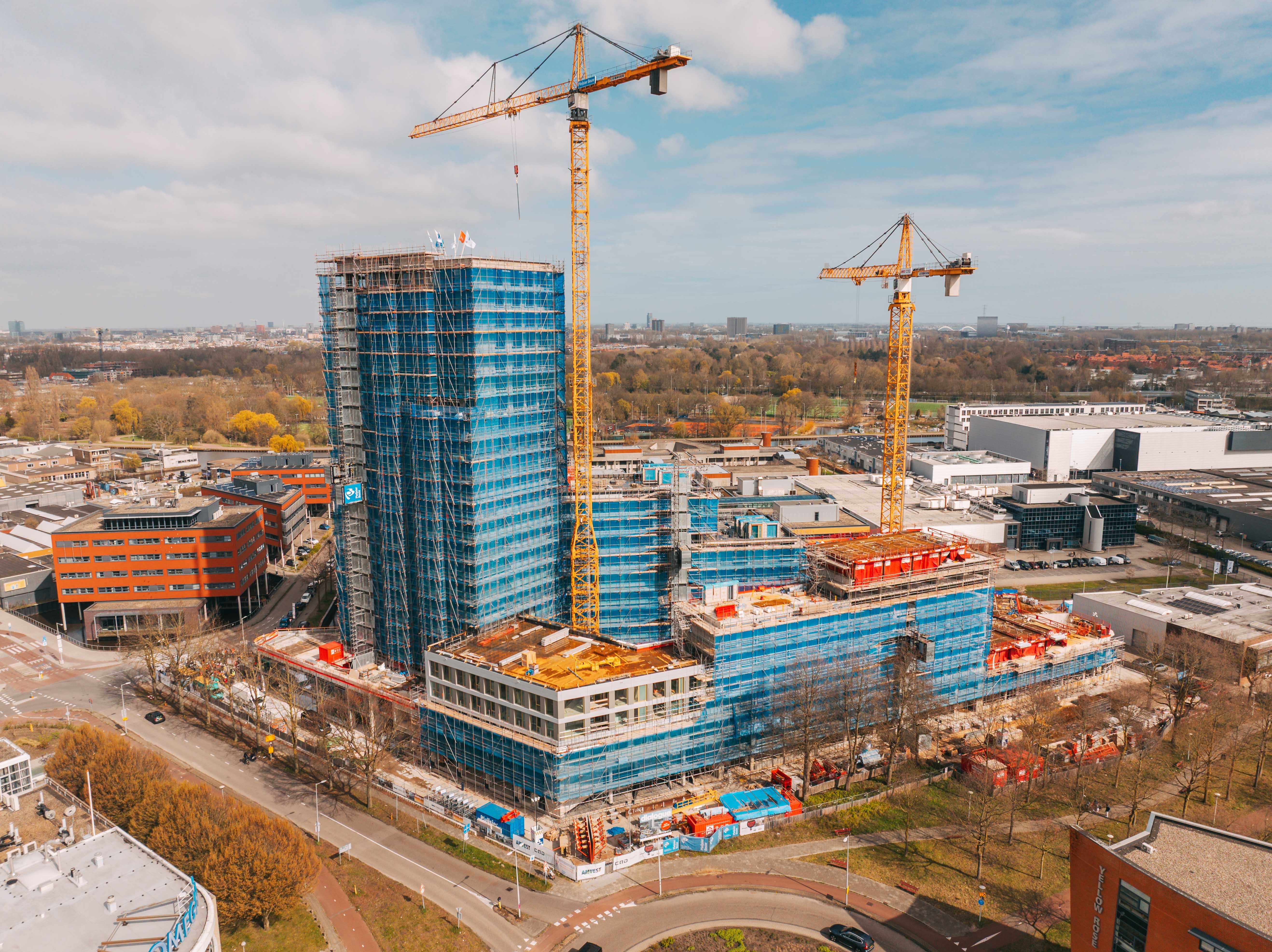 Ook aan de buitenzijde verandert het gebouw stap voor stap. Met elke gesloten gevel en geplaatst raam wordt het gebouw herkenbaarder als het toekomstige woongebouw.